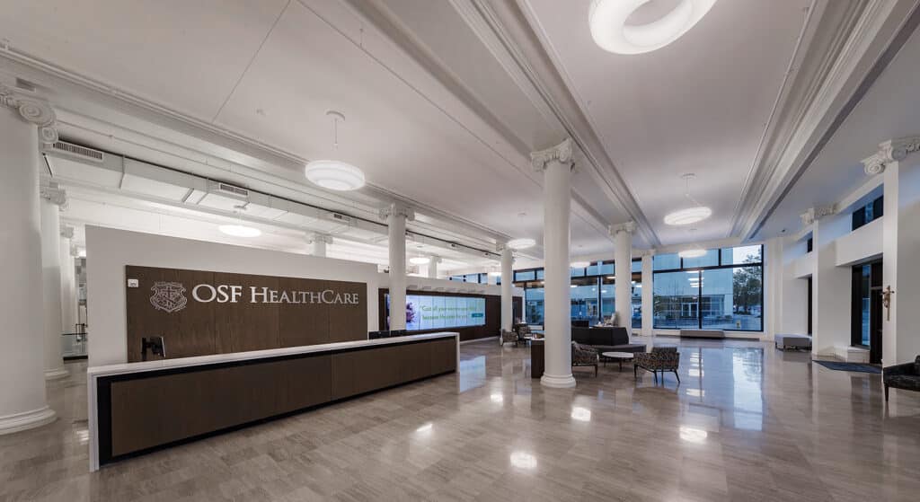 Pointcore helped OSF HealthCare transform its historic Ministry Headquarters in downtown Peoria. This complex, adaptive preservation project focused on restoring and modernizing a landmark facility originally constructed in 1904, while carefully maintaining its architectural character and historic significance.