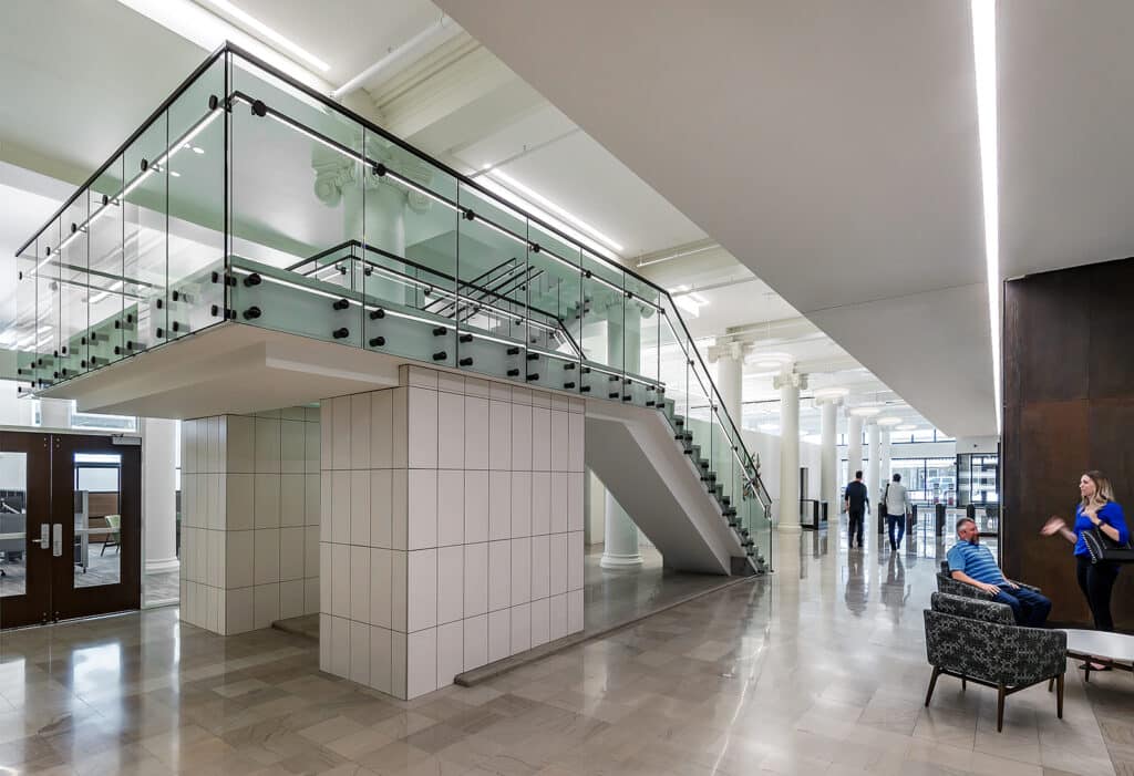 The exterior renovation included extensive tuckpointing, new terra cotta installation, GFRC spandrel panels, window replacement and custom aluminum castings while the interior scope introduced new structural steel, state-of-the-art mechanical systems, six modern elevators and high-end finishes. A key feature of the project is the seventh-floor executive space, where original plaster detailing and column capitals from the building’s original tearoom were carefully restored. Additional restoration work addressed existing plaster columns and two stairwells.